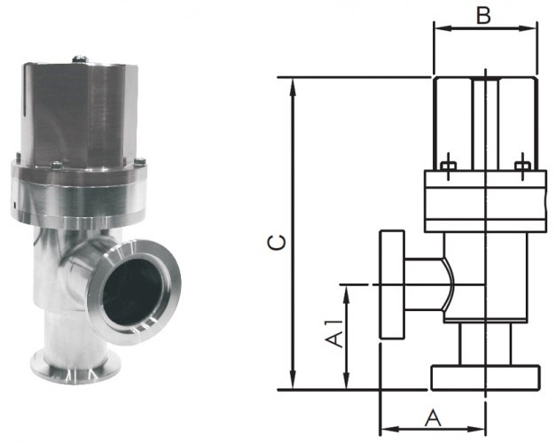 Клапан вакуумный угловой пневматический с фланцами CF100 (CF6") двустороннего действия (открытие и закрытие сжатым воздухом), без датчика положения и пневмораспределителя, витоновое уплотнение корпуса, нержавеющая сталь 304L